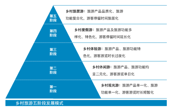 纵观乡村休闲旅游发展进程,其产业发展模式整体呈五阶段式发展历程。具体而言,第一阶段为单一的乡村观光游,即一般以农户自发式打造的农家乐为载体,目的在于为来往路人解决温饱问题,主要表现为旅游产品单一化、旅游功能单一化、游客游览时长短暂化,面对的主要是景区过路客群,游览时长约一至两个小时;第二阶段为乡村休闲游,主要表现为旅游产品、旅游功能均呈二元化发展模式,即在农家乐的基础上融入采摘、摄影等轻质化休闲产品,在解决游客游憩过程温饱问题的同时展现休闲娱乐功能,游客停留时间表现为单日化;第三阶段为乡村体验游,主要表现为旅游产品、旅游功能逐渐特色化,以满足游客基本的乡村过夜游需求为主;第四阶段为乡村度假游,主要表现为旅游产品及旅游功能兼具多样化及特色化,以中端民舍、乡村度假酒店等住宿产品为该梯队主打产品,以满足游客对精品住宿方面的需求为主要特色;第五阶段则发展至乡村旅居游阶段,主要表现为旅游产品品质化、旅游功能复合化,涉及可提供满足乡村艺术创作、青年创业等需求的多元空间,是当前和未来一段较长时间内乡村旅游业发展的主流趋势。
